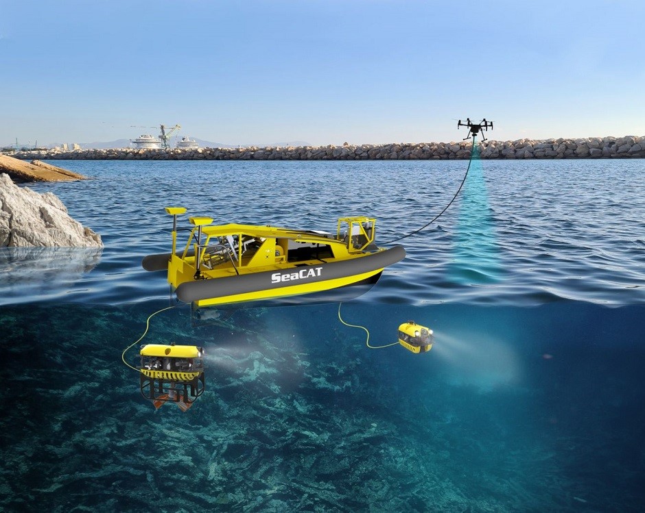 El sistema SeaClear2.0 opera mediante una flota coordinada de robots especializados que trabajan de forma integrada para la limpieza oceánica. Incluye una embarcación de superficie no tripulada que actúa como base logística para el suministro de energía y el procesamiento de datos del sonar, mientras que drones aéreos hacen el mapeo de residuos en superficie y robots submarinos realizan exploraciones autónomas hasta 100 m. de profundidad para detectar desechos de menor tamaño.